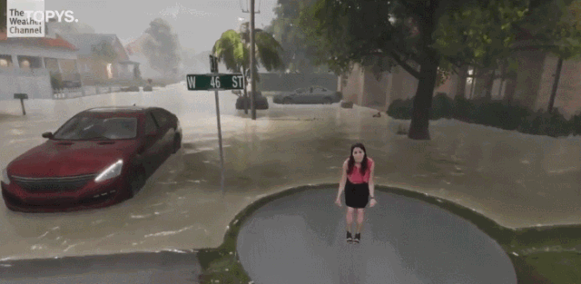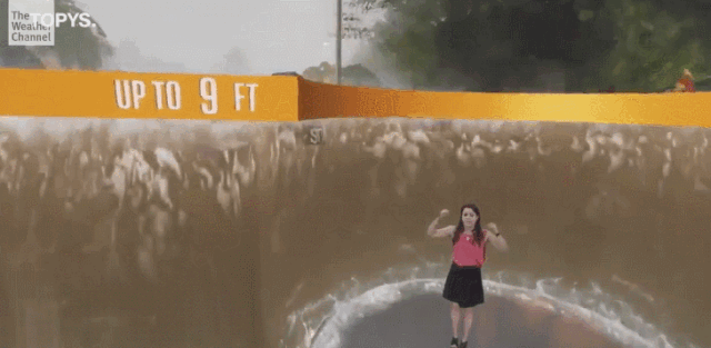 随着雨量增大,水位很快从3英尺涨至6英尺,别急,此时还只是主持人的头顶位置而已。