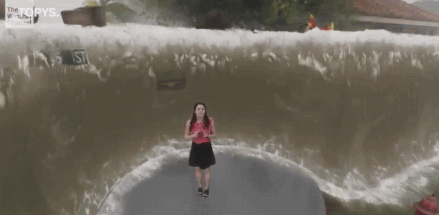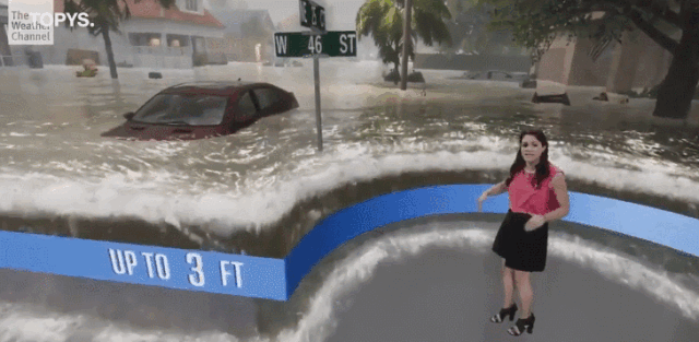 在美国CNN电视台旗下的天气预报栏目《The Weather Channel》中,就利用AR技术,现场模拟出了飓风可能会给城市带来的影响。