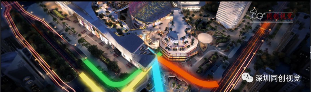 影片最后,在进行项目鸟瞰时,从项目建筑划出五彩线条,并与周边街景灯光相结合,营造无限缤纷、欣欣向荣的未来前景。此部分与片头线条相呼应,加强了缤纷的视觉效果,让观影的人印象深刻。随后带出项目logo进行定版,影片结束。